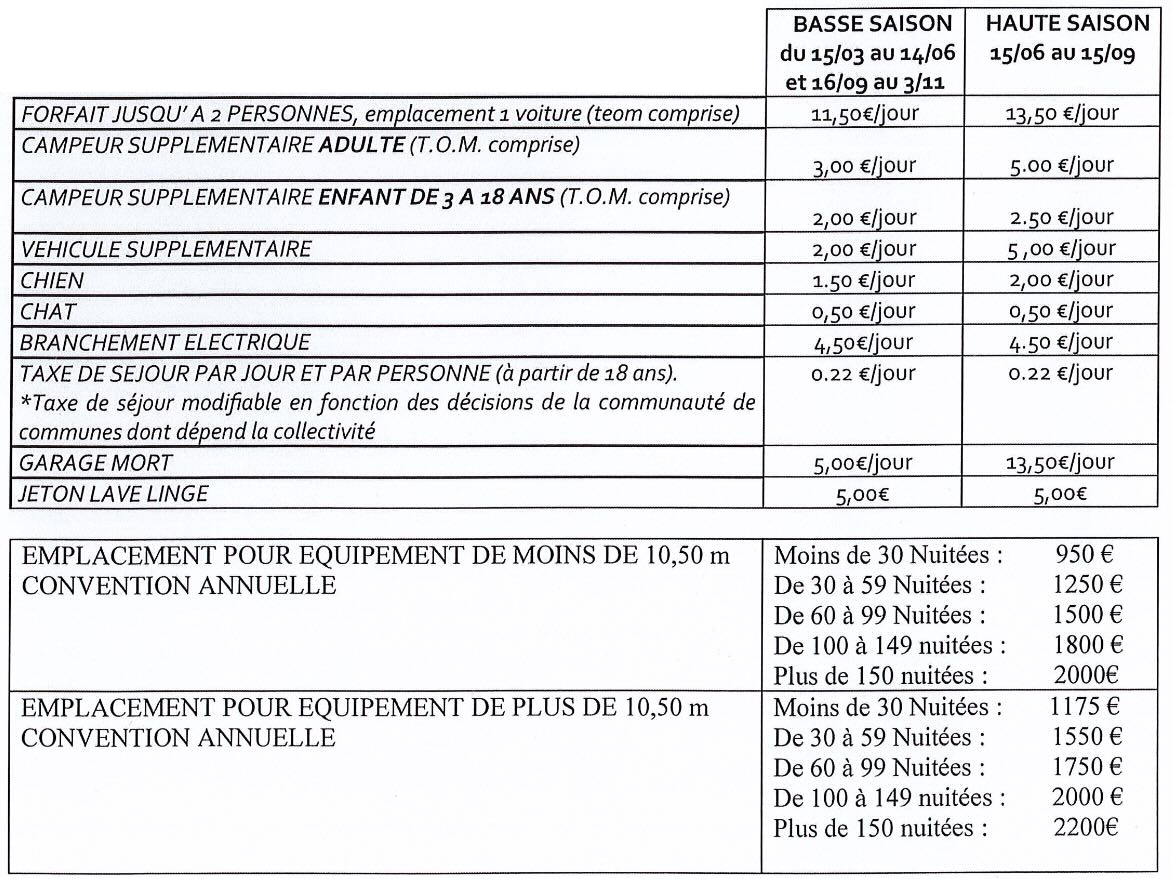 Le camping comprend 46 emplacements dont la moitié sont des emplacements loués à l’année par des habitués qui disposent de leur propre mobilhome. Le reste des emplacements est disponible pour des séjours de courte ou longue durée (la plupart avec des branchements électriques).
